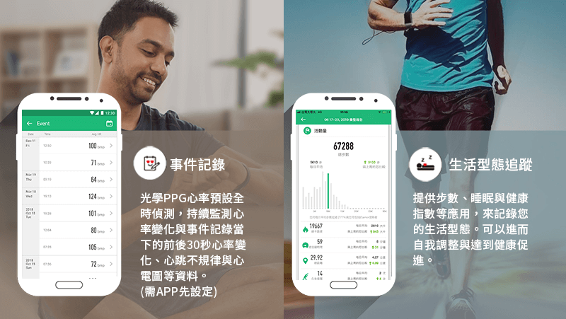 提供佩戴者每日訓練時數及健康增進紀錄• PPG感測計提供身體...