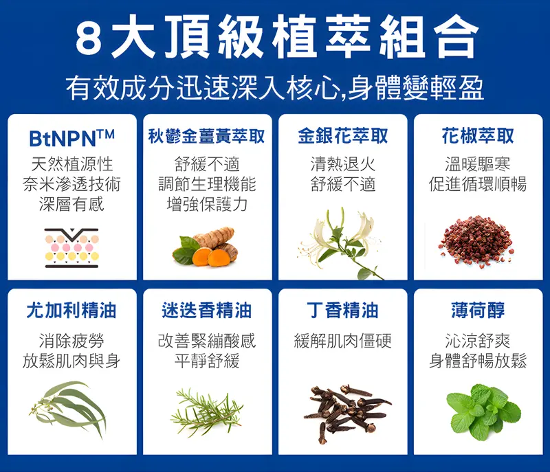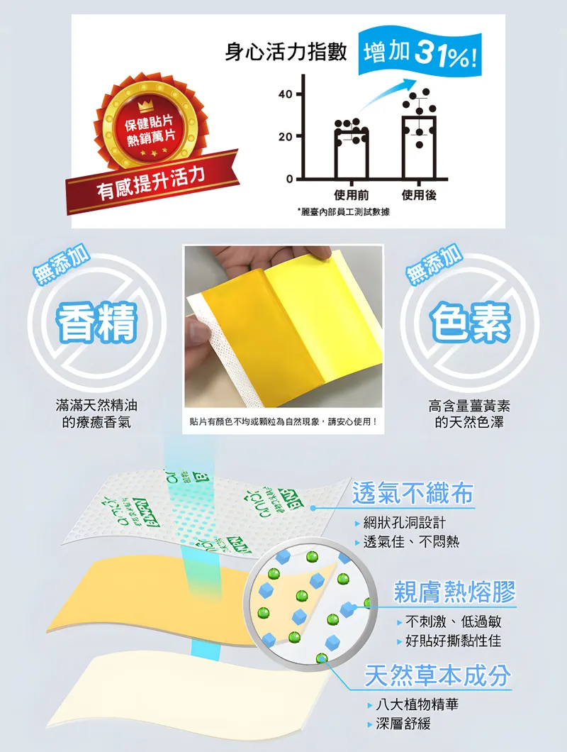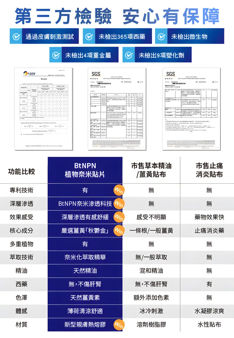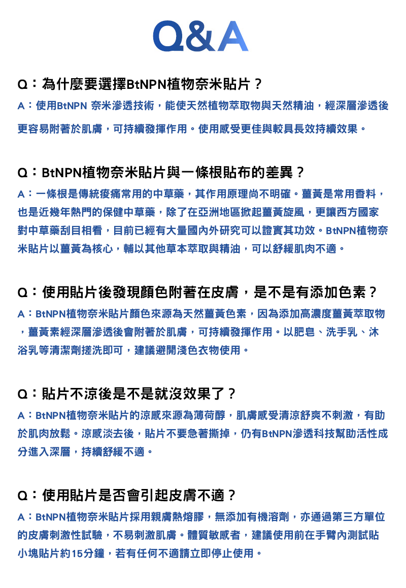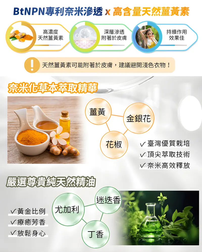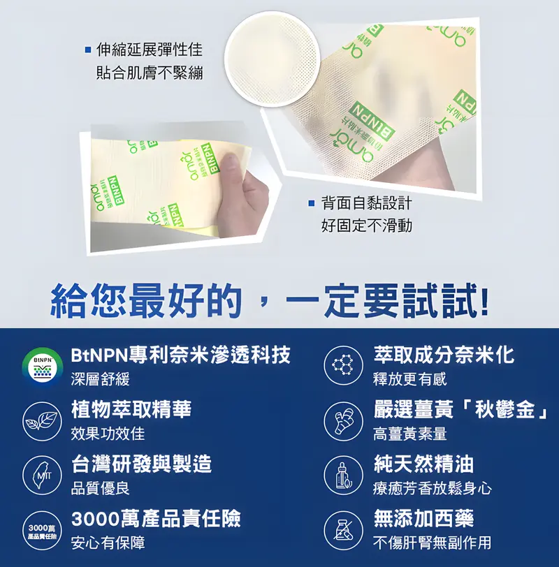 創新BtNPN專利奈米滲透科技,台灣大陸專利保證,讓你享受前所未有的深層效果!BtNPN植物奈米貼片能促進成分快速滲透。活性成分暢通無阻,高效吸收,達到深層舒緩放鬆!嚴選高薑黃素秋鬱金和尊貴天然精油,不僅能舒緩心靈,更能讓您的肌膚無負擔,給予您健康與天然草本的極致享受!採用親膚級熱熔膠,給您安心使用的品質保證!