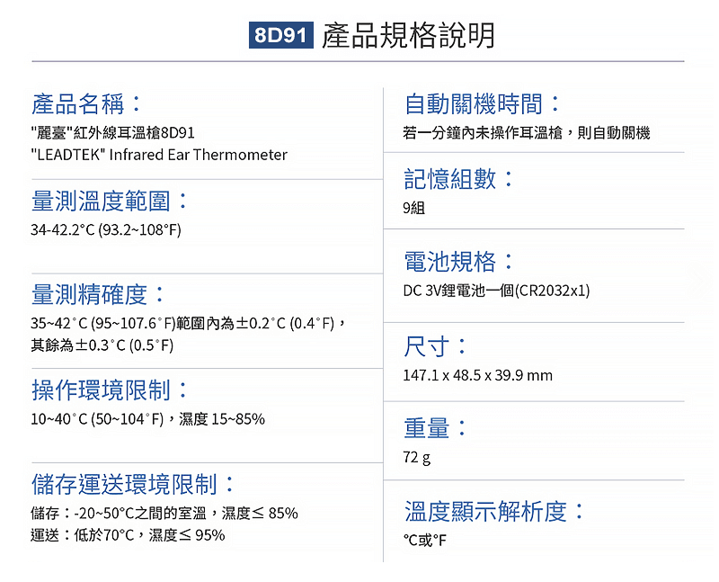 量測溫度範圍:34-42.2°C (93.2~108°F)