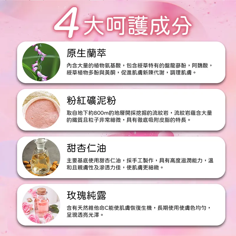 溫和安心配方,粉紅礦泥徹底吸附髒污