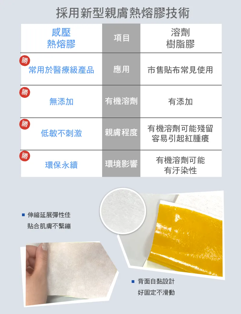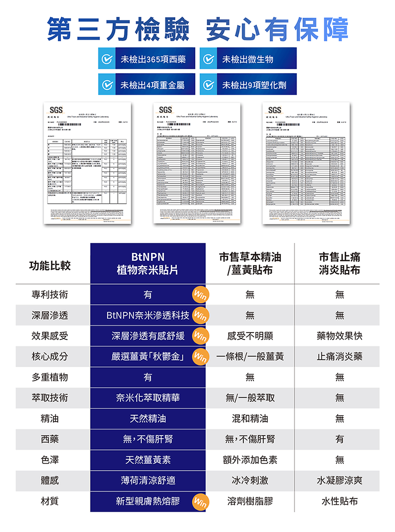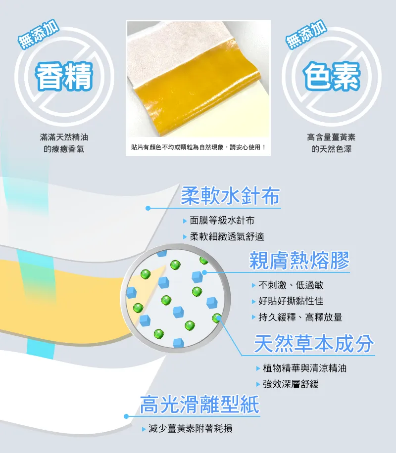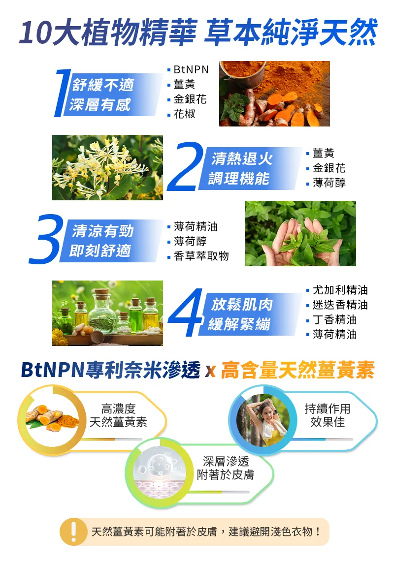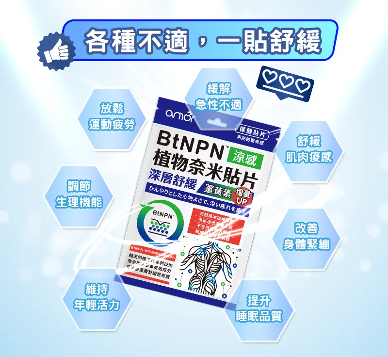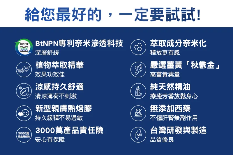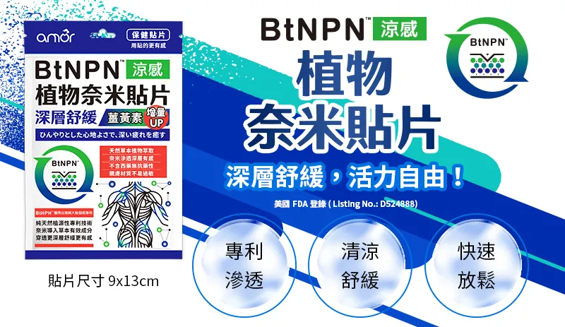 創新BtNPN專利奈米滲透科技,台灣大陸專利保證,讓你享受前所未有的深層效果! BtNPN植物奈米貼片能促進成分快速滲透。活性成分暢通無阻,高效吸收,達到深層舒緩放鬆! 嚴選高薑黃素秋鬱金和尊貴天然精油,不僅能舒緩心靈,更能讓您的肌膚無負擔,給予您健康與天然草本的極致享受! 採用親膚級熱熔膠,給您安心使用的品質保證! 有效日期:5年 ※本產品為貼身私人物品,一經拆封恕無法退貨,如欲退貨請勿拆封。