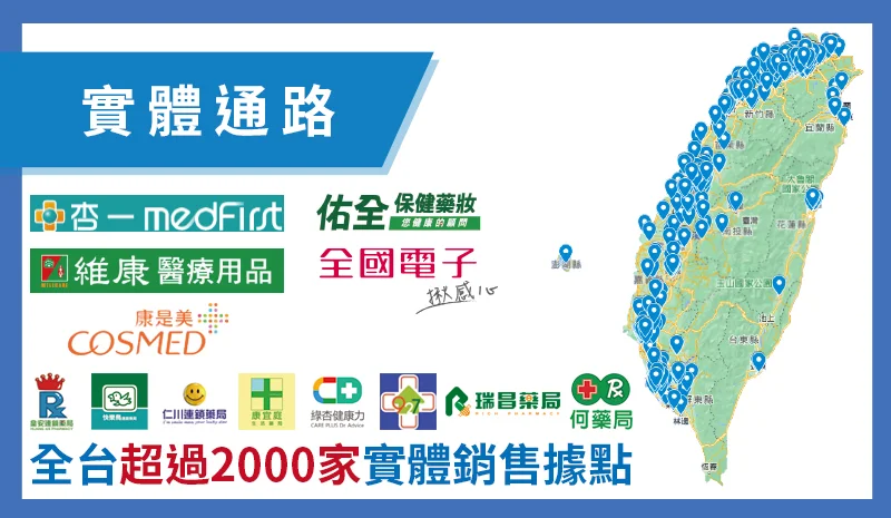 【實體通路據點】杏一醫療用品、維康醫療用品、佑全保健藥妝、全國電子