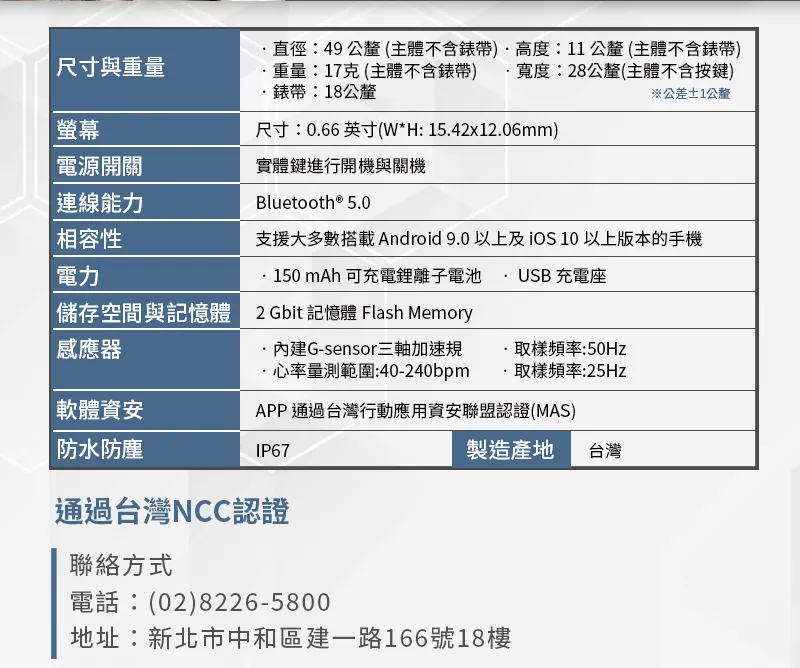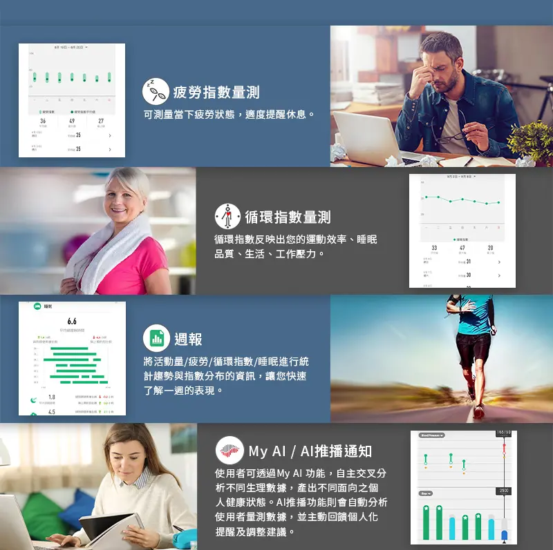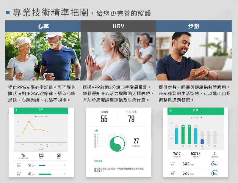 提供佩戴者每日訓練時數及健康增進紀錄• PPG感測計提供身體...