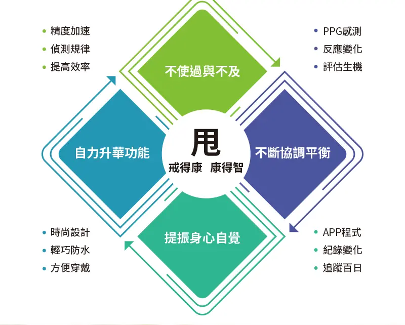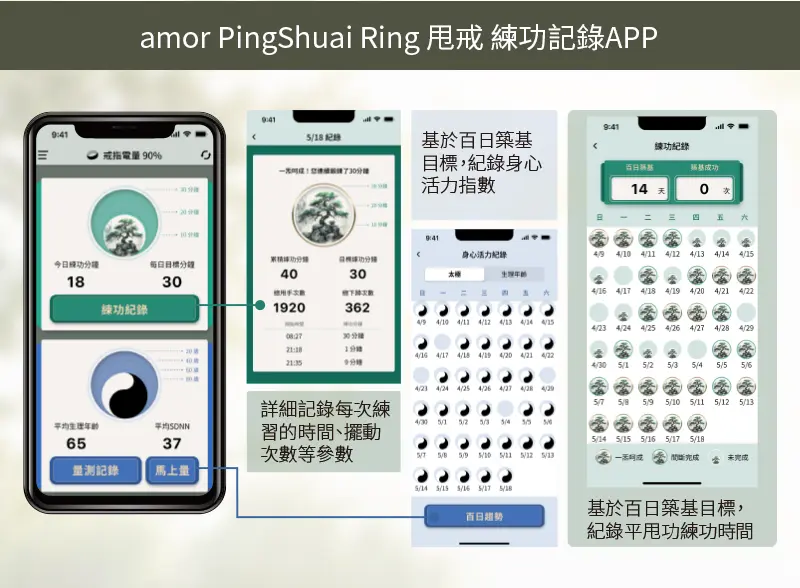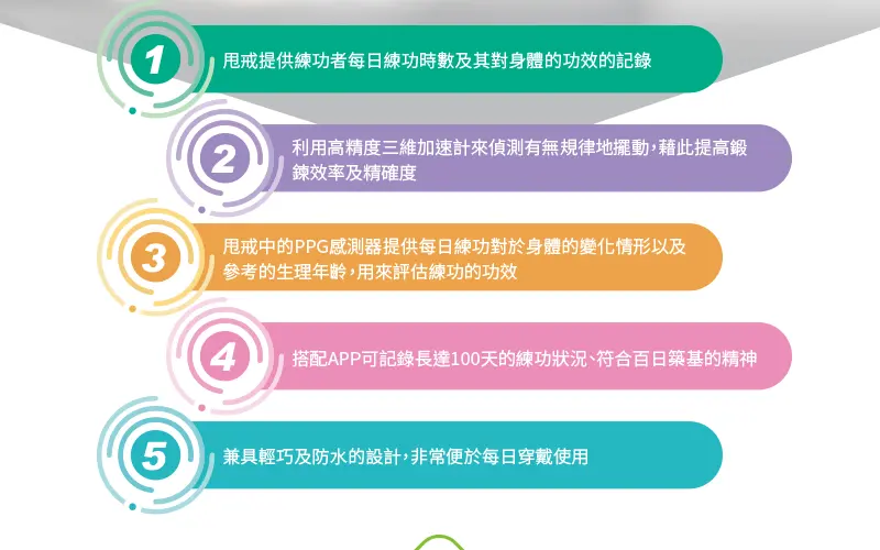 • PPG感測計提供身體的變化情形,以及參考的生理年齡,可評估每日訓練功效• 利用高精度三維加速計來偵測有無規律地運動,藉此提高鍛鍊效率及精確度• 搭配APP可記錄長達100天的訓練狀況,符合百日築基的精神• 兼具輕巧及防水的設計,便於每日穿戴使用